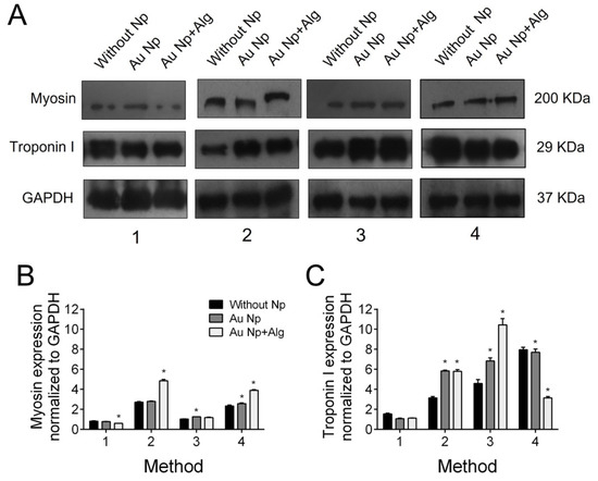 Immunodetection by western blot revealed troponin I and cardiac myosin expression in all scaffold elaboration methods (Figure 9A). In addition, densitometric analysis was performed to demonstrate that for myosin, in the case of the scaffolds of Methods 2 and 4, functionalization with both AuNp and AuNp+Alg caused an increase in expression. In the case of troponin I, it can be seen that in the scaffolds prepared by Methods 2 and 3, functionalization with AuNp+Alg also promoted increased expression (Figure 9B).