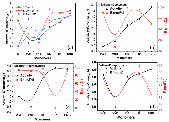 (a) Graph of polymerization activity between E/diene, E/diene/1-hexene and E/diene/propylene polymerizations, (b) comparison of E content and activity in E/diene copolymers, (c) comparison of E content and activity in E/diene/1-hexene terpolymers, (d) comparison of E content and activity in E/diene/propylene terpolymers.