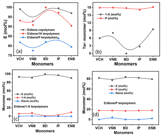 (a) Plots of E content in E/diene, E/diene/1-hexene, and E/diene/propylene polymerizations, (b) content of propylene and 1-hexene in E/diene/1-hexene and E/diene/propylene, (c) comparison of the content of E, diene, and 1-hexene, (d) comparison of the content of E, diene, and propylene.