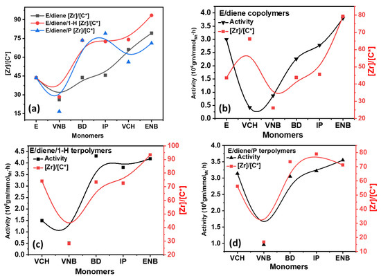 (a) Comparison of [Zr]/[C*] ratio between E/diene, E/diene/1-hexene and E/diene/P polymerizations, (b–d) are correlations between [Zr]/[C*] ratio and catalytic activities in E/diene, E/diene/1-hexene, and E/diene/propylene polymerizations, respectively.