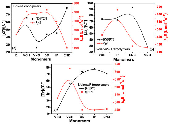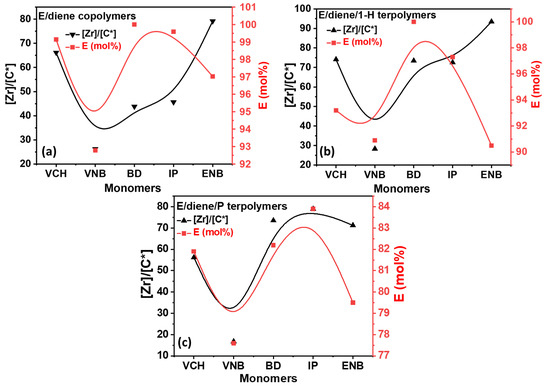 Figure 3 shows the catalytic [C*]/[Zr] active centers involved in the E/diene copolymerization, E/diene/1-hexene, and E/diene/propylene terpolymerization measured at 50 °C.