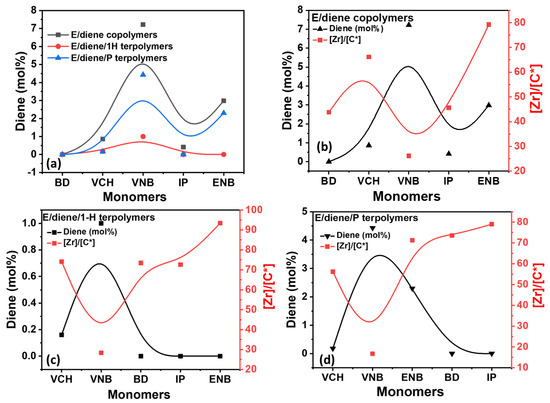 (a) Comparison between active centers and diene mole% in E/diene copolymers while (b–d) is the comparison of active centers and diene mole% in E/diene copolymers and E/diene/1-hexene and E/diene/P terpolymerizations.