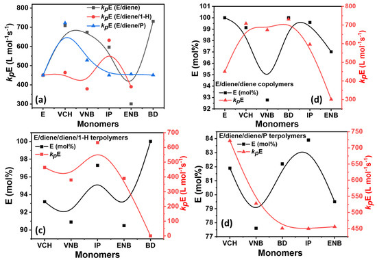 (a) Comparison of kpE value of E/diene, E/diene/1-hexene and E/diene/P polymerizations; (b–d) correlations between kpE value and E mol% in E/diene, E/diene/1-hexene, and E/diene/propylene polymerizations, respectively.