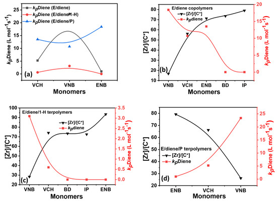 (a) Comparison of kpdiene value of E/diene, E/diene/1-hexene and E/diene/P polymerizations while (b–d) relationships between active center and kpdiene in E/diene, E/diene/1-hexene and E/diene/propylene polymerizations, respectively.