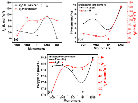 (a) Comparison of kp1-H and kpP in E/diene/1-hexene and E/diene/P polymerizations, (b) relationship between 1-hexene mol% and kp1-H in E/diene/1-hexene terpolymerization, (c) relationship between propylene mol% and kpP in E/diene/propylene polymerizations.