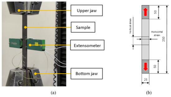 Tensile test; Experiment (a); Tensile sample (b).