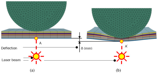 Deflection under the impactor from the simulation results; Initial state of impact (a); Maximum plate displacement under impactor (b).