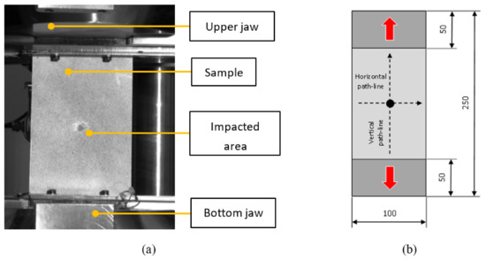 Post-impact tensile test; Experiment (a); Sample with paths and dimensions (b).