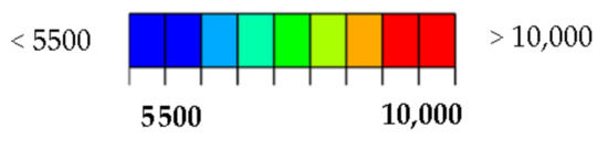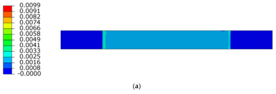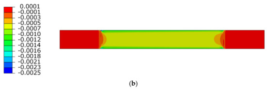 Max. principal strain distribution (μm/m) at load 110 kN; (a) Horizontal path—scale 1; (b) Horizontal path—scale 2; (c) Vertical path—scale 1; (d) Vertical path—scale 2.