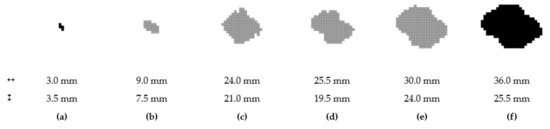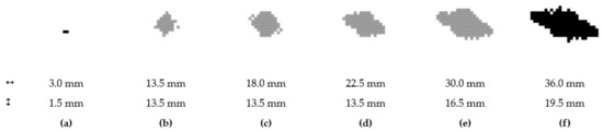 Damaged area at layer no. 1; 0.5 J (a); 1.0 J (b); 2.5 J (c); 5.0 J (d); 7.5 J (e); 10.0 J (f).