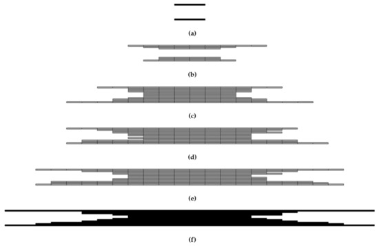The cross-section profile of the damaged area; 0.5 J (a); 1.0 J (b); 2.5 J (c); 5.0 J (d); 7.5 J (e); 10.0 J (f).