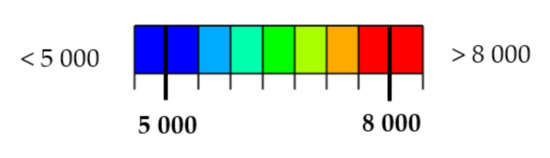 Max. principal strain distribution (μm/m) at load 80 kN; (a) Horizontal path—scale 1; (b) Horizontal path—scale 2; (c) Vertical path—scale 1; (d) Vertical path—scale 2.