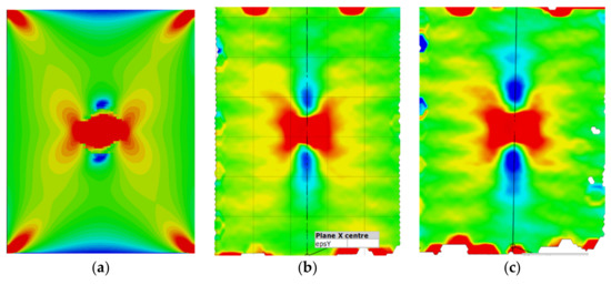 Max. principal strain distribution (μm/m) at load 80 kN; (a) Simulation; (b) Experiment sample 1; (c) Experiment sample 2.