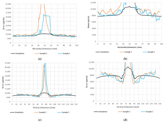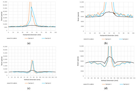 Comparison of max. principal strain distribution (μm/m); (a) Horizontal path at load 80 kN; (b) Horizontal path at load 110 kN, (c) Vertical path at load 80 kN; (d) Vertical path at load 110 kN.