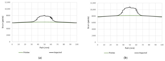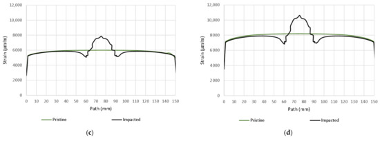 Max. principal strain distribution (μm/m); Pristine 80 kN (a); Damaged (10 J) 80 kN (b); Pristine 110 kN (c); Damaged (10 J) 110 kN (d).
