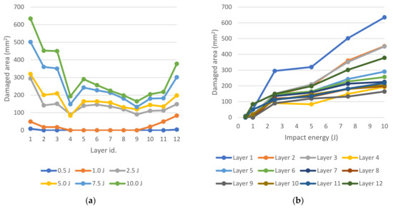 Ply damage distribution; Damaged area vs. layer (a); Damaged area vs. impact energy (b).