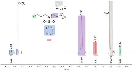 Prior work on the polymerization of sulfonylaziridines demonstrated control over poly(sulfonylaziridine) molecular weights through varying the ratio of the monomer to the initiator [23]. To determine whether the polymerization of BocAz can also be controlled, we performed a series of polymerizations in DMF, in which the ratio of the BocAz:BuN(K)Ts varied between 20 and 80 (Table 1). In all cases, either precipitates formed during the course of the polymerizations or the reaction mixtures gelled. The resulting polymers were characterized by GPC and 1H NMR spectroscopy. Both the GPC and 1H NMR spectroscopic end-group analyses showed that the monomer-to-initiator ratio had some impact on the molecular weight of the resulting poly(BocAz). Unfortunately, the dispersity (Ð) was very high, and it was inconsistent with a controlled polymerization. We believe the high dispersity was due to the precipitation of the poly(BocAz) during the course of the reaction. The polymerizations performed with higher BocAz:BuN(K)Ts ratios did not produce high-molecular-weight material.