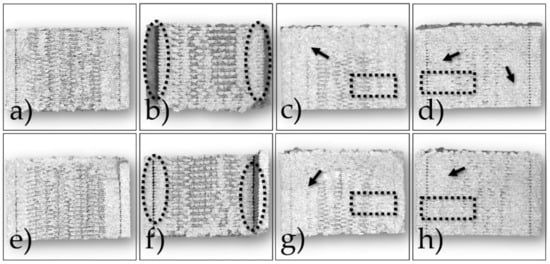 Figure 3c,d,g,h). According to these outcomes, the eight configurations can be grouped in two classes with similar internal morphologies depending on the flow rate used. Considering the class printed with the lowest flow rate, i.e., 100%, the two configurations printed with the highest layer thickness of 140 µm, i.e., 4 and 8, show samples with more defects with respect to those obtained with the lowest layer thickness of 90 µm, i.e., 5 and 7. Concerning the group with the highest flow rate of 110%, the differences among the internal sections of the four printing configurations are less significant.