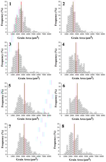 Table 7 summarizes the average grain area of each group. All samples are characterized by equiaxed grains, as already acknowledged by Gong et al. [