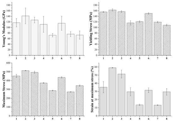 Moving to the 100% flow rate samples, the trend reported for the 110% samples is confirmed, as the highest tensile properties are achieved with configuration 4 which is the one characterized by the high-level thickness layer and by the low-level nozzle temperature. Configuration 8 ranks just after configuration 4 displaying a tensile modulus and a yield strength comparable with configurations 5 and 7, but a much higher tensile strength and ductility. Even in this case the higher layer thickness plays a major role endowing configurations 4 and 8 with a much higher tensile strength with respect to configurations 5 and 7.