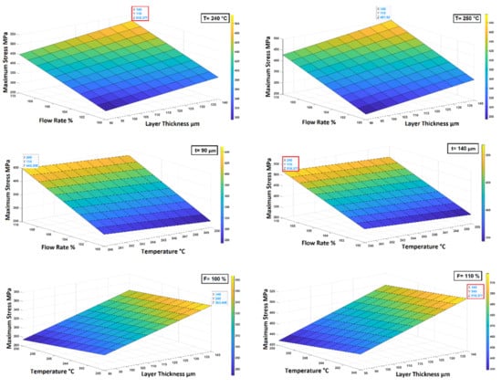 Based upon all the results obtained and the analysis performed, the optimization process was concluded with the study and the evaluation of the surface response which allows us to correlate how the mechanical property under study varies as a function of the printing parameters. At first a quadratic approximation function was considered in the study to obtain the best possible fitting, but it was found out that the quadratic terms were null, so a linear approximation function was employed. Considering that the statistical significance of parameters interactions is negligible in most cases, a linear approximation function without interaction was considered. The surface response of each mechanical property was evaluated and was plotted by setting constant one of the parameters as shown in