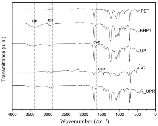 The synthesis of R-UPR from BHPT (PET glycolysis) was confirmed. First, the depolymerization of PET by glycolysis and transformation to BHPT was verified, by observing bonds corresponding to the OH, CH3, CH2, and CH groups in the FT-IR spectrum of the latter, which PET does not have. Subsequently, the polycondensation of BHPT to form UP was verified by the incorporation of a band at 1643 cm-1 attributed to the C=C bond (unsaturation), and the formation of R-UPR is indicated as the C=C bond is not found in its spectrum. FT-IR indicated that crosslinking occurred between the unsaturation sites (C=C bond) in UP and St.