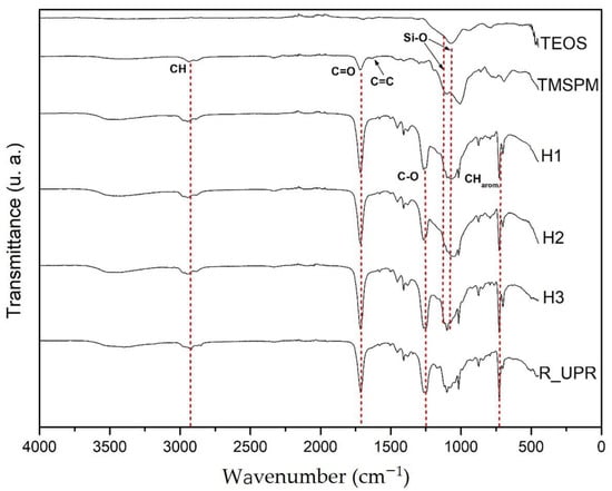The spectra of H1, H2, and H3 are quite similar; therefore, they are described together as follows. The bands at 1160 and 1071 cm−1 correspond to the Si-O-Si and Si-O bonds, present in TEOS and TMSPM, indicating the interaction between the OH groups of hydrolyzed TMSPM with the OH groups of hydrolyzed TEOS []. Moreover, we identified C=C aromatic (1452 and 730 cm−1) and C=O (1714 cm−1) bonds attributed to the R-UPR, and CH2 (2889 cm−1) and C=O (1714 cm−1) bonds attributed to the organofunctional groups of TMSPM; an absence of bands in the 1680–1600 cm−1 range (C=C) was also observed, which indicates the chemical interaction between the pre-polymerized UPR and the TMSPM by free radical polymerization during the elaboration of the hybrid solution R_UPR–SiO2 []. This demonstrates the chemical interaction between organic and inorganic phases by means of TMSPM, and therefore the formation of the hybrid solution.