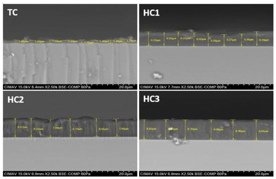 Four SEM micrographs of the cross sections of the coatings with several thickness. Measurements correspond to TC, HC1, HC2, and HC3.