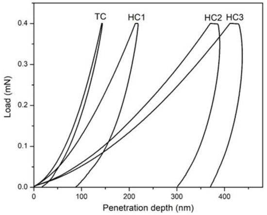 Figure 5 shows loading–unloading cycles for hybrid coatings with 0:1:0 (TC), 1:2:0.25 (HC1), 1:1:0.25 (HC2), and 1:0:0.25 (HC3) molar ratios of R-UPR:TEOS:TMSPM, respectively. The samples presented permanent deformation at the maximum load of 0.4 mN and showed maximum penetration depth of 149.9 nm, 218.2 nm, 386 nm, and 429.1 nm for TC, HC1, HC2, and HC3, respectively. These values are less than 10% of the thickness obtained (by SEM) for each coating, which indicates that the substrate does not influence the measurement of the mechanical properties []. In addition, these values indicate a decrease in the plastic behavior of the coatings due to the increase in the amounts of silica.