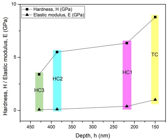 Figure 6 shows the mechanical properties, H and E, versus the penetration depth of the HC3, HC2, HC1, and TC coatings. It can be observed that as the silica content increased, the depth of penetration decreased and the mechanical properties (hardness and elastic modulus) increased. This indicates that the silica reinforced the R-UPR. The improvement of the mechanical properties in the hybrid coatings agrees with Taber’s research; as the TEOS content increases, the formation of Si-O-Si bonds tends to increase [].