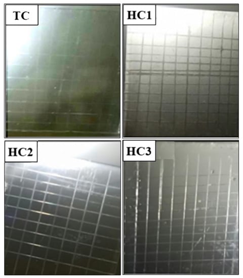 Figure 7 shows photographs corresponding to samples tested by cross-cut test method described in ASTM D3359-17, which we can observe a removed area percent of 0%, due the edges of cuts are completely smooth, and no square of the mesh showed detachment. Therefore, in according with adhesion classification described above, samples correspond to 5B, which indicates a perfect adhesion of the coatings with the glass substrate, both in and in the hybrid coatings, in which it was also demonstrated that they had a homogeneous structure: HC1 and HC2 (R-UPR–TMSPM–TEOS) and HC3 (R-UPR–TMSPM).