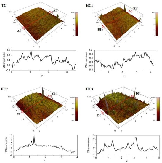 The tridimensional images of roughness by AFM, with an area of 5 µm × 5 µm in the surface of the TC, HC1, HC2, and HC3 coatings.