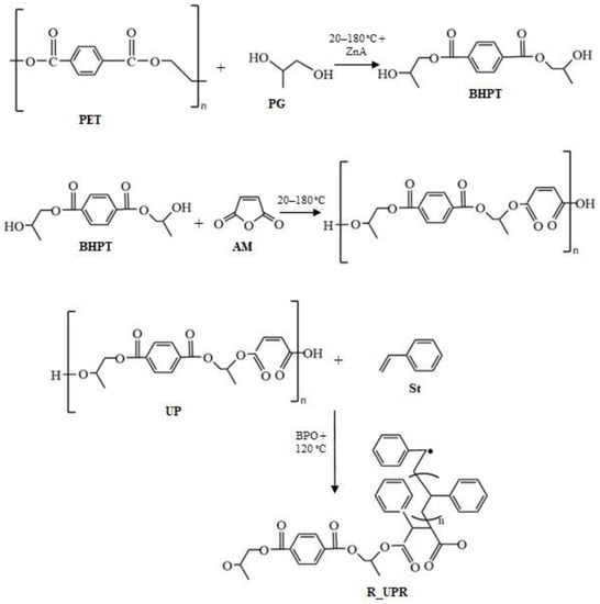 Scheme 1 shows the proposed reaction mechanism of R-UPR, which is explained below. First, glycolysis of PET takes place, which is depolymerized by transesterification with the addition of PG to form BHPT. Next, BHPT reacts with MA, by polycondensation, to form UP. After that, UP reacts with St, which attacks its unsaturations and crosslinks with UPs or another St, to finally form a three-dimensional network, which is the R-UPR.