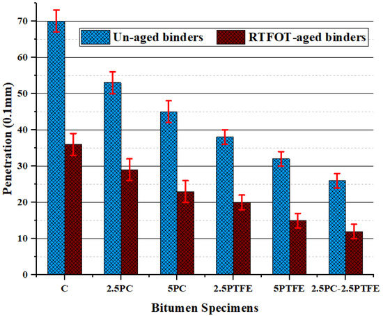 The penetration index values of binders before and after aging.