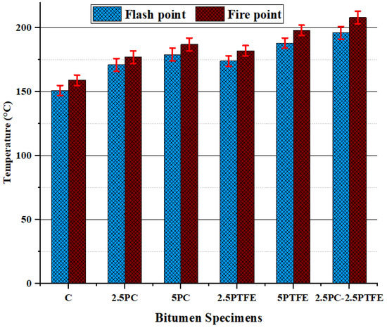 - Flash and fire point and softening point temperatures substantially increased as the PC. PTFE concentration in the bitumen mix increased slightly. At the same time, ductility and penetration values dramatically decreased, indicating that the binder has become considerably harder by modification and is much more appropriate for high service temperatures. The chemical reaction between neat bitumen and modifiers, PC and PTFE, is the cause of the rheological behavioral modification.