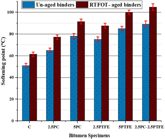 When the influence of PC and PTFE on the penetration index of the bitumen binders is studied, it is shown that PMBs have higher PI values than neat bitumens grade, with an increase of 1.83%, 6.2%, and 2.5% based on the additive amounts, as presented in Figure 6. Therefore, this implies that PC and PTFE-modified bitumen with greater PI values can resist fracturing at low temperatures and provide more resistance against permanent deformations and thermal cracking at elevated temperatures [50].