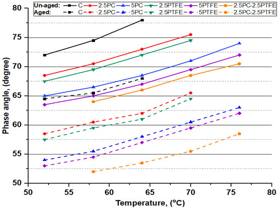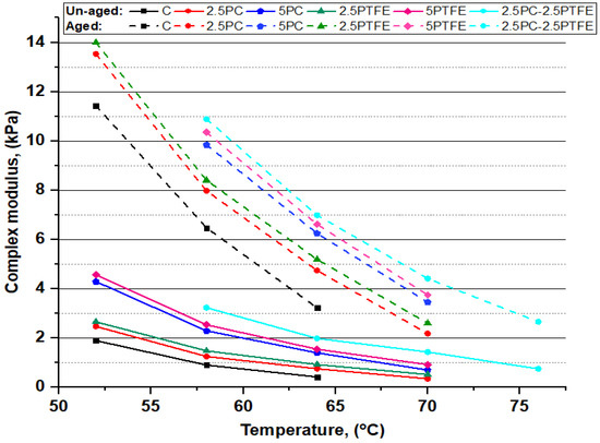 Figure 7 shows that as the PC and PTFE content increases in the blend, the complex modulus (G*) values in both aged and un-aged bitumen specimens have dramatically increased, depending on the percentage of modifiers, but decreased with the increasing temperature. However, the results presented in Figure 8 show that phase angle (δ) values for all the bitumen specimens decreased with increasing the percentages of PC and PTFE in neat bitumen but increased with temperature, indicating that PC and PTFE-modified bitumen have a higher elasticity. Moreover, a more minor phase angle (δ) and higher (G*) value indicates that polymer-modified bitumen has significantly better resistance to permanent deformations.