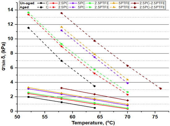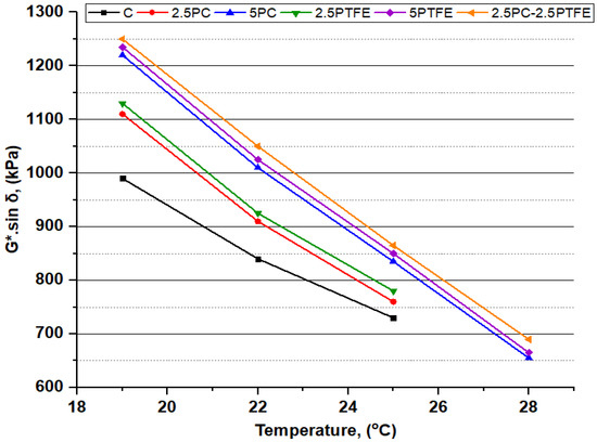 G*.sinδ and temperature relationship of all the PAV-aged binders.