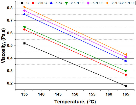 The outcomes of the RV test, shown in Figure 11, reveal that when compared to pure bitumen, the modified bitumen exhibits higher viscosity values of all bitumen samples alongside an increase in polycarbonate and polytetrafluoroethylene content in the blend, indicating that the binders’ flow ensures pumping safety. In comparison to pure viscosity grade 70 bitumen, RV test results for PCMB, PTFEMB, and PCMB-PTFEMB increased by 44%, 50%, and 55.75% at 135 °C, and 111.10%, 127.8%, and 138.88% at 165 °C, respectively, as bitumen-modifier content is increased [53].