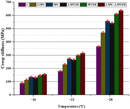 - BBR test results revealed that with the application of the load, the hardness of the PC and PTFE-modified bitumen exposed to low-temperature ranges and the rate of their hardening speed significantly increased. BBR results show that as modifiers’ content increases, the base binder’s creep stiffness values increased by 74.8%, 75.8%, and 74.5% at −16 °C, −22 °C, and −28 °C, respectively, which indicates that bitumen becomes more rigid and stiff by modification.