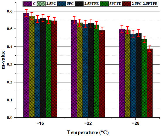 Creep stiffness of PC and PTFE-modified bitumen increased at low temperatures due to a rise in the percentage content of modifiers in the blend compared to neat bitumen, as shown in Figure 12, indicating that bitumen becomes more rigid as a result of additives in blends. On the other hand, as shown in Figure 13, m-values declined as the additive rate increased [48]. According to these findings, it was determined that cracking may occur in modified bitumen specimens at low temperatures.