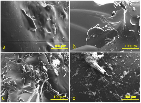 SEM images of bitumen specimens before aging: (a) C, (b) 5PC, (c) 5PTFE, (d) 2.5PC-2.5PTFE.