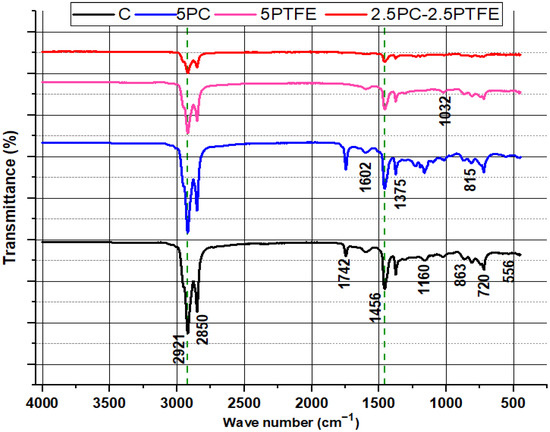 The aromatic structure is characterized by the breathing vibration of asymmetrically substituted benzene (spectral bands at around 1602 cm−1). In contrast, the branched aliphatic structure is characterized by the bending vibration of methyl C-H (spectral bands at around 1375 cm−1 and 1456 cm−1). The bending vibration absorption spectrum of the aromatic tape in the original asphalt is represented by peaks at 815 cm−1. Peaks 863, 720, and 556 cm−1 also show aromatic para, meta, and ortho functional groups, respectively. Stretching vibration of sulphoxide (S=O) produces a smaller peak at about 1032 cm−1 in all FTIR spectra [56], and spreading vibrations of sulphoxide bonds (S–O) were found at 1160 cm−1. The peak at 863 cm−1 remained consistent throughout the reaction (at both 20 and 65 °C) and appeared due to crystalline matter (fayalite, diopside, clinoferrite). The bending vibration of Si-O-Si and Si-O-Al produces peak intensities in the 400 cm−1 –600 cm−1 range [56,57]. After RTFOT aging, the peak positions and intensities of varying peaks in the FTIR spectra of neat and modified-bitumen is presented in Figure 17. It was observed that peak positions of the curves were quite similar to un-aged specimens, but peak values of the FTIR spectra at wavenumbers ranging from 1700 to 400 cm−1 were slightly decreased due to aging and the presence of PC and PTFE polymers, indicating that bitumen chemical composition has changed, which leads to an increase in SPT values and a decrease in penetration values.