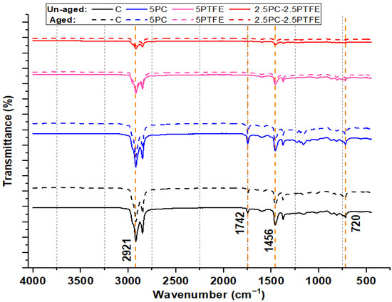 Figure 16 and Figure 17 show the FTIR spectra of neat and PMBs-modified specimens (PCMB, PTFEMB, and PCMB-PTFEMB) before and after aging, and characteristic peaks can be used to identify molecular structures. The FTIR spectra of the neat and PMBs, as shown in Figure 16, reveal twelve distinct spectral bands. The transmittance of wide range of molecular structures is represented by spectral bands at unique wavenumbers. The strongest absorption peaks at 2921 cm−1 and 2850 cm−1 appear in the spectra of all the binders. The asymmetric stretching vibration of C-H causes peaks at 2921 cm−1, while the symmetrical stretching vibration of C-H causes peaks at 2850 cm−1. Furthermore, Figure 16 shows the FTIR spectra of the base and modified-bitumen, which reveals that there was no water retention in the samples because the O-H groups have no peak at wavenumbers greater than 3150 cm−1.
