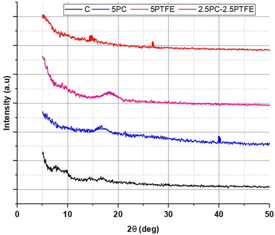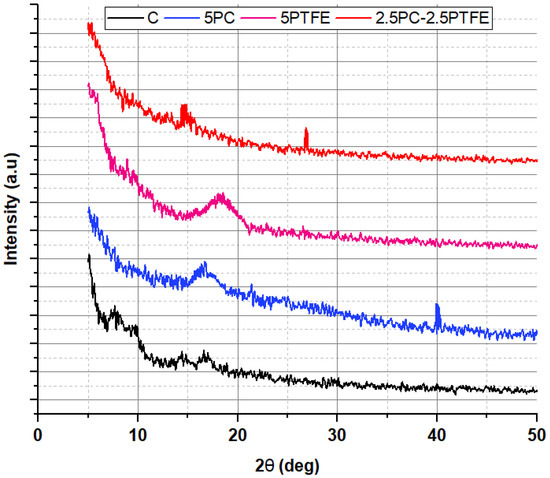 Two peaks were identified for PC-modified bitumen XRD spectra, as shown in Figure 18—one broad peak at (17.2°) and another sharp peak at a stage where the 2θ value is about 40°. For the PTFEMB, only one peak was identified at a point where the 2-theta value is 18.1°, which agrees with the findings published for thin PTFE coatings with thicknesses of 94, 142 nm [58]. This implies that PTFE interacts with the bitumen’s main macro-molecular groups and is distributed evenly throughout the mixture. The crystalline structure of RTFOT-aged bitumen decreased with the utilization of modifiers, PC and PTFE, into neat grades of bitumen, as shown in Figure 19. In other words, the bitumen blend was dominated by the amorphous structure formed by the reaction of bitumen and additive.