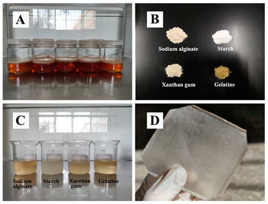 1.5 g of CMBC was placed in a heated magnetic mixer (Shanghai Lichenbang Instrument Technology Co., Ltd, DF-101Z, Shanghai, China) for 30 min at 45 °C at a stirring rate of 900–1000 r/min while different proportions of sodium alginate (Beijing Coolaber Technology Co., Ltd., Beijing, China) (Figure 1B), starch (SR) (Chengdu Jinshan Chemical Reagent Co., Ltd., Chengdu, Sichuan Province, China), xanthan gum (XG) (Shanghai Yuanye Biotechnology Co., Ltd., Shanghai, China), gelatin (GEL) (Tianjin Windship Chemical Reagent Technology Co., Ltd., Tianjin, China) were added to produce a final concentration of 1.5 percent solution (0.2%, 0.4%, 0.7%, 1%, 1.3%, all the above proportions are based on the mass of the solvent, the same below) along with different levels of glycerin (Shanghai Yuanye Biotechnology Co., Ltd., Shanghai, China), sorbitol (Tianjin Fuyu Fine Chemical Co., Ltd., Tianjin, China) (SO), PEG 400 (Beijing Coolaber Technology Co., Ltd., Beijing, China), and PEG 6000 (Beijing Coolaber Technology Co., Ltd., Beijing, China) (0.2%, 0.4%, 0.6% ). The mixtures were stirred to dissolve the components and then the film solution (Figure 1C) was placed in an ultrasonic apparatus (Kunshan ultrasonic Intrasonic Co., Ltd., KF-101Z, Kunming, China) operated at 50 HZ for 12 min to remove air bubbles. The film was cast on a PTFE mold (Yangzhong Fuda Insulation Electric Co., Ltd., Yangzhong, Jiangsu Province, China), dried in a blast box (Shanghai Yiheng Scientific Instruments Co., Ltd., Shanghai, China) at 30 °C for 48 h, and then removed (Figure 1D).