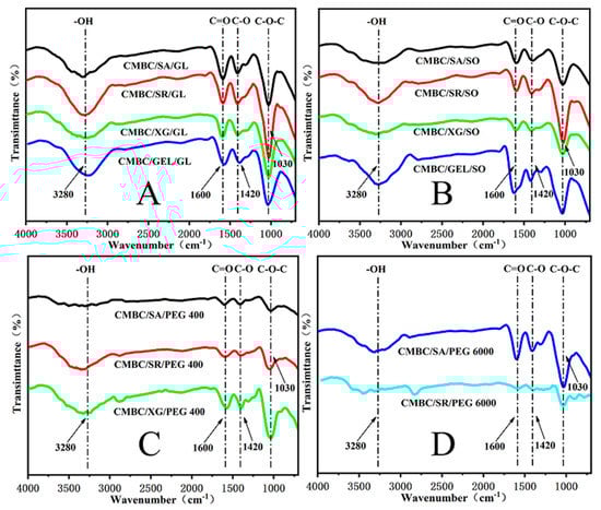 FTIR images of the composite films (A): CMBC/SA/G, CMBC/SR/Gl, CMBC/XG/Gl & CMBC/GEL/Gl; (B): CMBC/SA/SO, CMBC/SR/SO, CMBC/XG/SO & CMBC/GEL/SO; (C): CMBC/SA/PEG 400, CMBC/SR/PEG 400 & CMBC/XG/PEG 400; (D): CMBC/SA/PEG 6000 & CMBC/SR/PEG 6000).