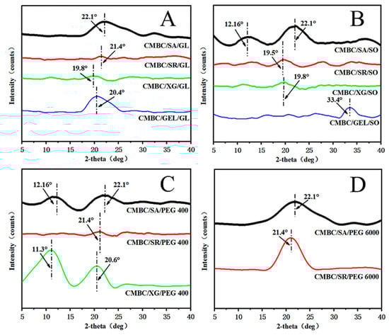 XRD patterns of the composite films (A): CMBC/SA/G, CMBC/SR/Gl, CMBC/XG/Gl & CMBC/GEL/Gl; (B): CMBC/SA/SO, CMBC/SR/SO, CMBC/XG/SO & CMBC/GEL/SO; (C): CMBC/SA/PEG 400, CMBC/SR/PEG 400 & CMBC/XG/PEG 400; (D): CMBC/SA/PEG 6000 & CMBC/SR/PEG 6000).