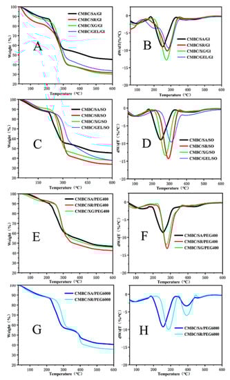 Figure 5A–F illustrates the thermal performance of the films. The CMBC/GEL/GL, CMBC/SA/PEG 6000, and CMBC/SR/PEG 6000 composite films all showed two other pyrolysis peaks in addition to a pyrolysis peak of bound water near 100 °C [], indicating that these three composite films had a nonuniform internal structure leading to poor thermal stability. However, the initiation temperature of the CMBC/SR/GL composite film was significantly lower than the temperatures of the other composite films. The main reason for this is that some of the starch was not dissolved during the preparation of the composite films and collected on the film surface. The TDG-TG diagram shows that the pyrolysis peak of the composite film was between 250 °C and 311 °C. In addition, from the DTG-TG curves in Figure 5 and related calculations, the following main parameters commonly used to reflect the pyrolysis characteristics can be obtained: