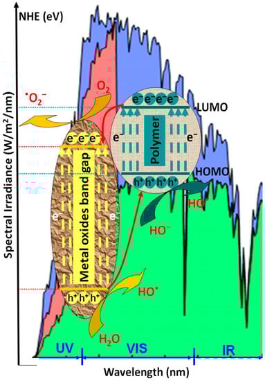 Photocatalysts based only on metal oxide semiconductors present limitations in terms of charge carrier recombination and mobility, chemical stability, and large band-gaps values, which restrict the light absorption spectrum in the UV region [47,48,49]. As presented in Figure 1, when coupled with metal oxide semiconductors, the conducting polymers work as photosensitizers due to their high charge mobility properties.
